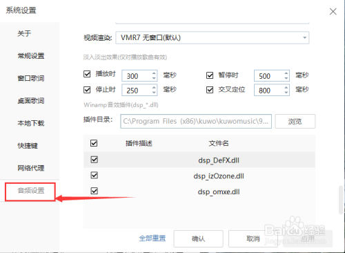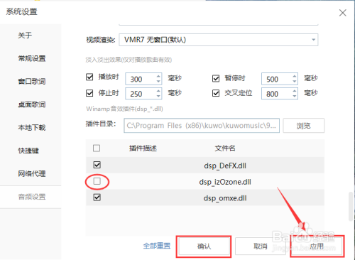 进入“音频设置”界面后,在“Winamp音效插件(dsp_dll)”下方点击“dsp_izOzone.dll”左侧的方框,使方框中的勾取消掉。见下图