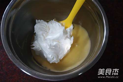 6将三分之一的蛋白糊加入到蛋黄糊中,切拌均匀。