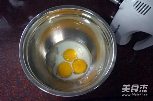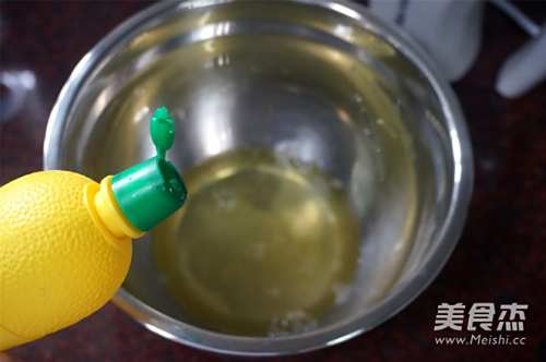 2打发蛋白:蛋白加入2克柠檬汁,1克盐,33克的细砂糖(分三次加入),低速打发至粗泡状态。