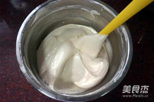 7然后将其倒入剩余的蛋白糊中,拌均匀,如图。