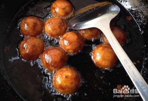 待油温稍微降下来,红糖沉入油底,再依次放入圆子,开小火慢炸,这时不要去动它,可以经常晃动锅子