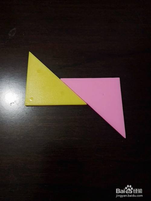 拿出一个绿色小号的三角形板放在粉色三角形板的上面,如图所示。