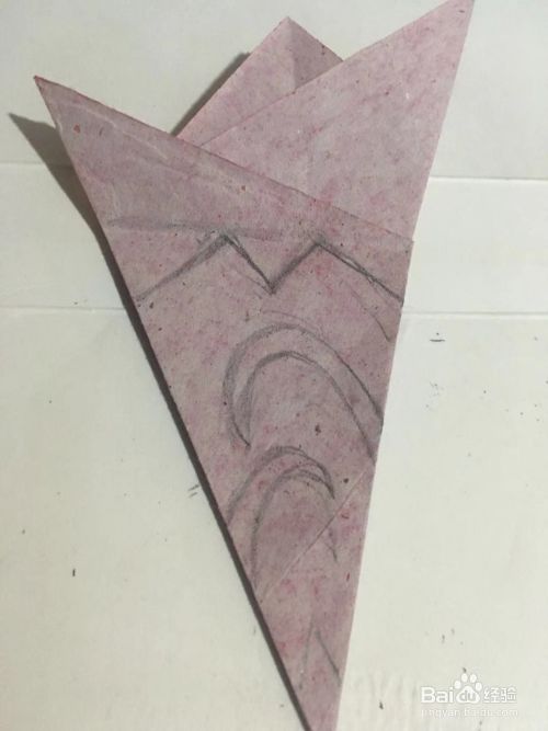第五步 折好之后 拿起来 整理一下 均匀地分成五等分 拿起绘图铅笔 按图示简单地画上两道弯曲的双边线 尖角上画上花蕊部分