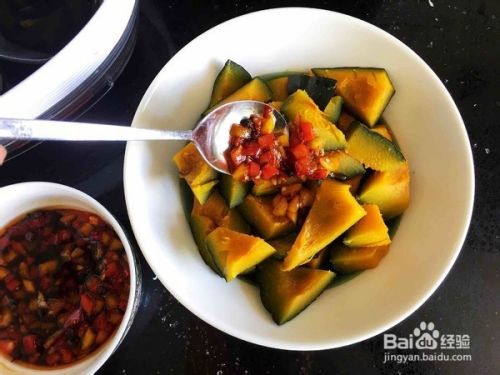 绿皮黄瓤的南瓜浸泡在料汁里,上面点缀了爽口的彩椒粒和蒜蓉,朴实无华