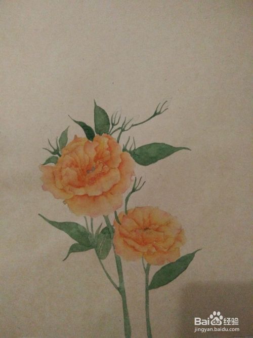 在绿色里加一些水,调淡,晕染洋桔梗的花苞,等画面干后,在之前的橙黄色里加一点红色,小范围的加深两朵花的根部颜色,让它更立体一点
