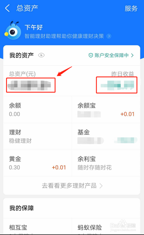 第四步,进入总资产页面后,就能看到自己的总资产,也包含了余额、余额宝、基金等;