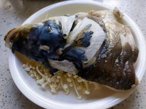 盘子内依次放入葱白和生姜片、金针菇、鱼头。淋入蒸鱼豉油。