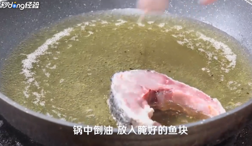 锅中倒油,放入腌好的鱼块炸制。