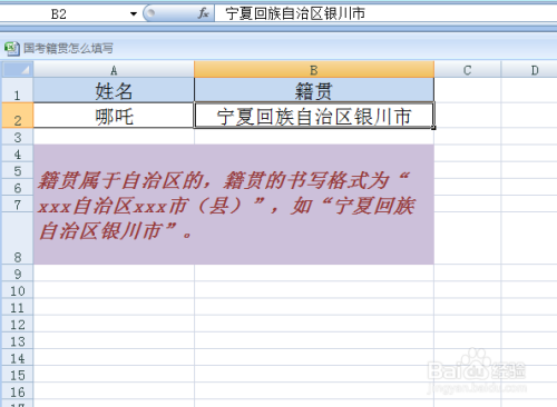 籍贯属于自治区的,籍贯的书写格式为“xxx自治区xxx市(县)”,如“宁夏回族自治区银川市”。