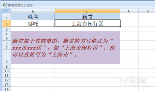 籍贯属于直辖市的,籍贯的书写格式为“xxx市xxx区”,如“上海市闵行区”,也可以直接写为“上海市”。