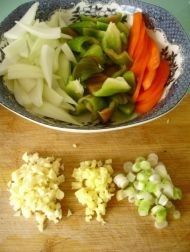先把猪肉切成菱形块备用,蒜拍碎末、葱切小丁、姜切末备用。洋葱,青椒,胡萝卜各切片,切成菱形块也行,好看一些