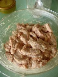 要把淀粉均匀的黏附在肉上,要干一些为好,如太干可加点水抓匀。