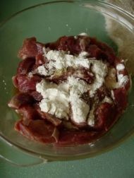 在切好的肉段里放入1g苏打粉抓匀,腌制20-30分钟备用。腌制后,用清水清洗一遍攥干