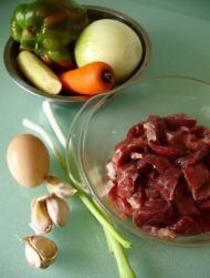 原料图:猪瘦肉,胡萝卜,洋葱,鸡蛋,青椒,葱,姜,蒜。