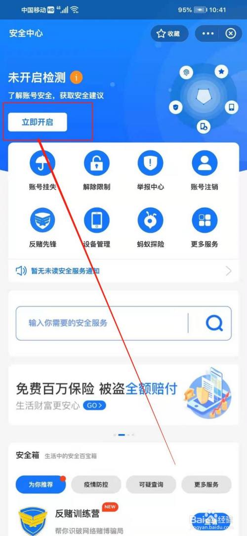 点击“安全中心”点击“立即开启”安全检测完成支付宝账户风险即可解除