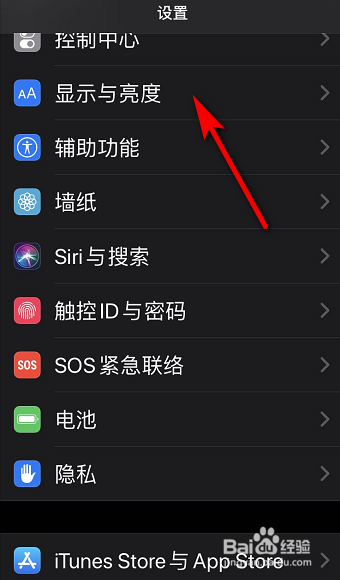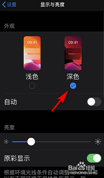 接着我们在显示与亮度页面下的外观点击【深色】,并将自动按钮显示灰色。