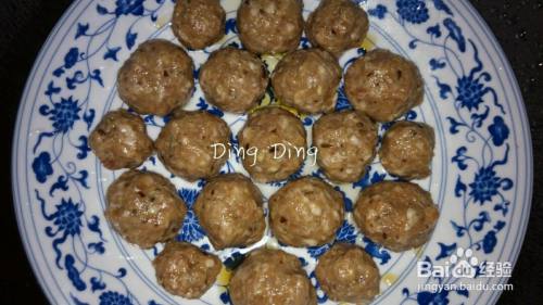 挤出一个肉丸时,把肉丸挤到一碗干净的水里,另一只手从水里捞出肉丸,就不粘手了,顺便把肉丸整形摆盘。<我这大大小小的肉丸,小的特意弄小可以挤挤碟里的小空位,刚好够宝贝一囗一个>
