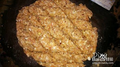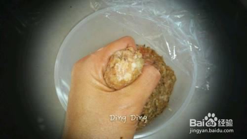 剁好后装碗里,用手抓一把肉肉象这样挤出肉丸,比一般汤圆大一些就好。<这相片是刚刚补拍的,因为没想要发菜谱,少了这步骤。这是昨晚做肉丸剩一些要来包饺子的,平时我剁好肉肉不装碗里就直接挤肉丸了>