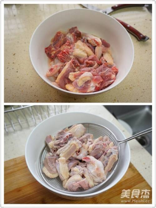 1鸭肉洗净切小块,再用开水烫洗(或者放在锅里焯一下水),滤干备用