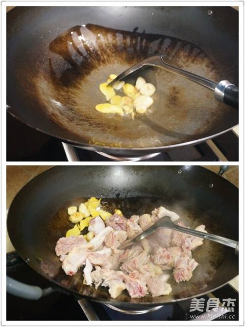 3下油热锅后放入姜蒜爆香,再倒入鸭肉煸炒片刻