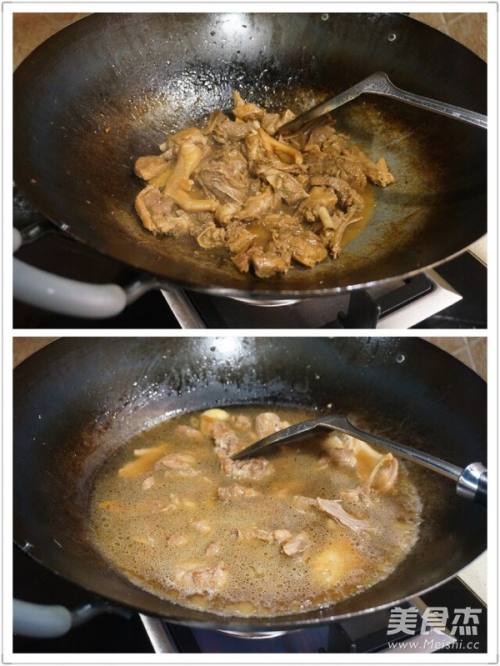 6翻炒片刻就可倒入冷水(水要末过鸭肉),再放入少许酱油、料酒和一小匙糖(酱油可以不用放太多),水沸后关小火,煮到收汁即可(大概半小时)