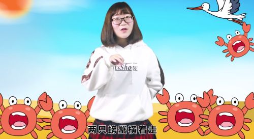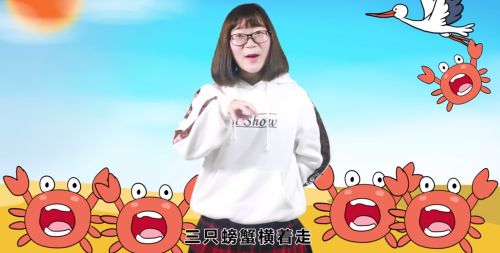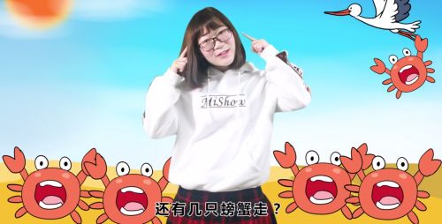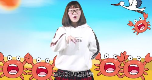 1第一句,“五只螃蟹横着走”,伸出右手手掌,张开手指。