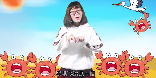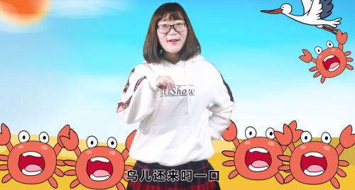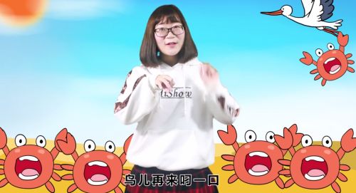 2第二句,“鸟儿飞来叼一口”,左手做成小鸟嘴巴状,伸向右手螃蟹。