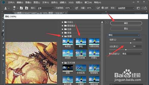 在对话框中选择“纹理”-“颗粒”,调整合适的强度,点击“确定”即可。