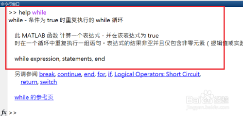 第一步我们可以在matlab命令行窗口中输入“help while”,看一下while循环的使用方法,如下图所示: