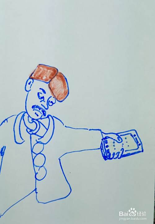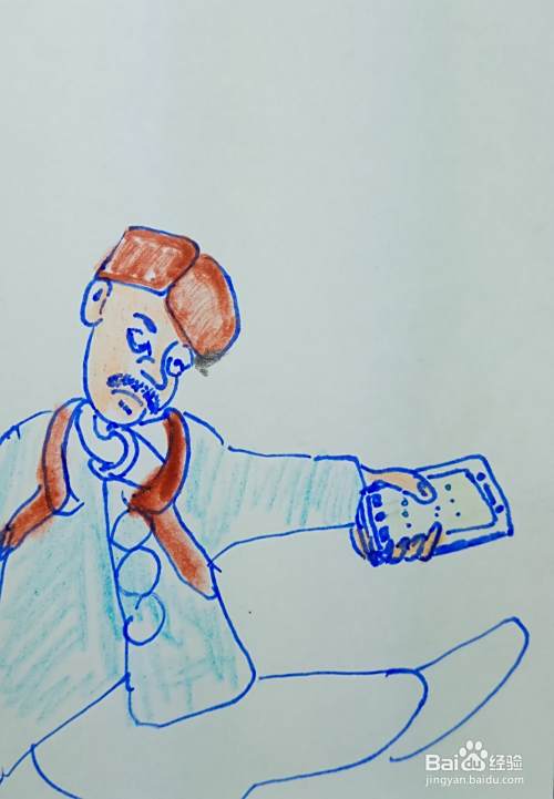 用水彩笔涂出光头强头上戴着的帽子色彩,并用线条修饰一下智能手机。