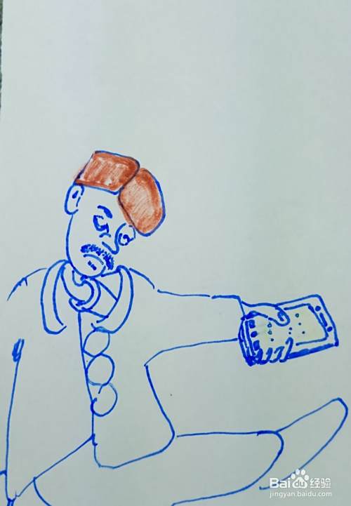 再画出光头强的身体部分和他左手里拿着的一个智能手机的外形轮廓。