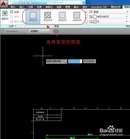 点击图案填充按钮之后,会激活“图案填充编辑器”菜单,在该菜单的图案模块,可以对图案进行选择,通过下拉功能可以选择不同的图案样式,图案选择好之后,接下来开始填充。