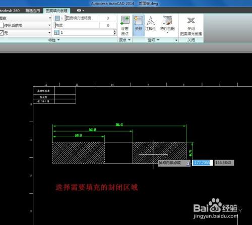 点击软件界面上方菜单栏中的“默认”菜单,在“默认”菜单下方找到绘图板块,其中有一个图案填充图标按钮,可以对封闭区域进行图案填充。