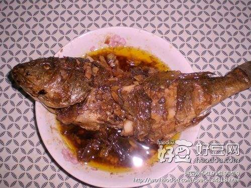 5加入适量酱油,糖,葱花,放水,没过鱼就行,(鱼大了,大勺放不下,给弄两段了),中火炖熟,大火收汁,出锅,装盘。