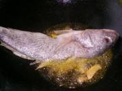 3起锅,油热,爆香姜和大料,放大王鱼,随后放入辣椒,煎成金黄色翻面!