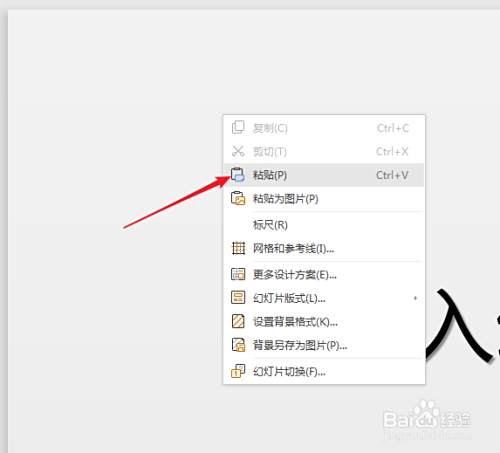 回到幻灯片中,在编辑区的空白区域点击鼠标右键,点击【粘贴】,或者按键盘快捷键Ctrl+V。