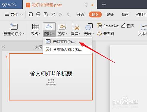 打开幻灯片,点击【插入】—【图片】—【来自文件】。