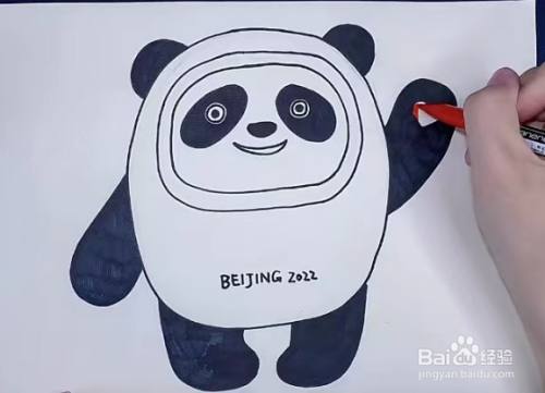 接着,给画好的冰墩墩涂上好看的颜色,先给冰墩墩的眼睛外框、鼻子、耳朵和四肢涂上黑色,在冰墩墩的腹部写上“beijing2022”的字样