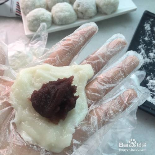 虽然戴上手套可以防粘,但是还是最好沾一点水,防粘效果更好一点~ 把糯米团用右手的食指中指像剪刀一样把面团展开,形成中间厚四周薄的面皮。中间放入适量红豆沙。 像包包子一样把面皮包起来,我知道糯米面包起来很难,但是为了吃再难也要克服!( -᷅_-᷄ )