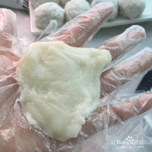 然后!把蒸熟的糯米团晾凉。。。 为什么呢。。。因为现在包它烫手啊( ̄▽ ̄) 然后戴上一次性手套 就可以开始了!