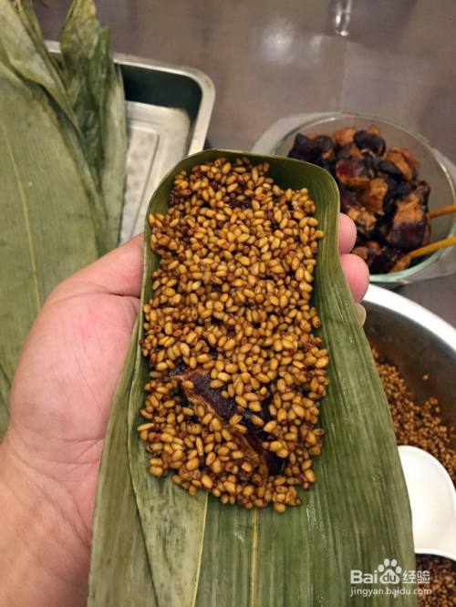左手托着粽叶,放入40克左右的糯米,铺平在粽叶底部。(如果你怕包出的肉粽大小不一,可以用量杯。)