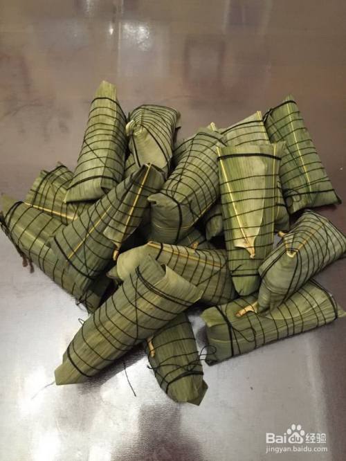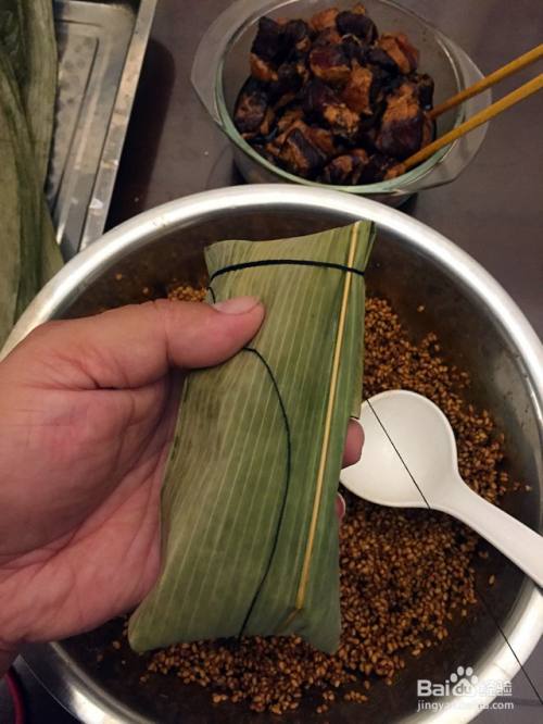 均匀地绕到另一头,粽子在手中调个头,同样绕上两三圈打上结,一个肉粽就完成了。对了,线不要扎太紧,要不然粽子不容易煮透。