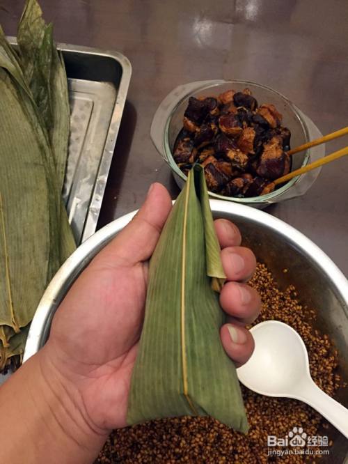 把粽叶尾部从糯米处往上折,盖住所有糯米。