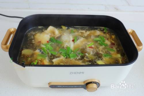 煮熟的鱼片,熄火,放香葱即可。热乎乎,鱼肉鲜嫩,酸菜脆爽,汤汁很开胃,很好吃。