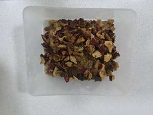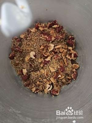 晾凉黑糖牛奶液的时间处理坚果粉 1.核桃平底锅小火炒熟磨粉 2.大枣掰碎 3.处理完和葡萄干全部混合一起