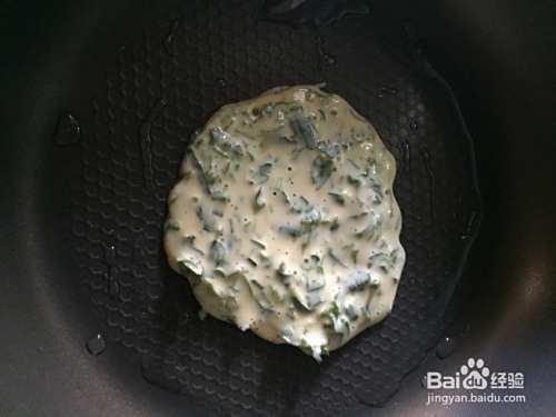 舀一勺面糊放入锅中,此时调中火 待面糊表面又些凝固后 调小火翻面