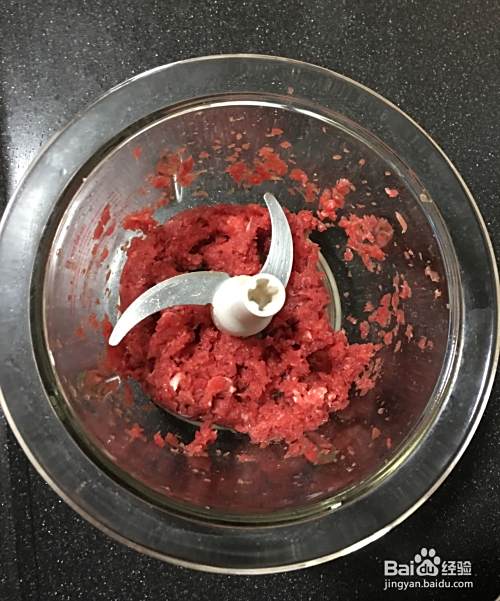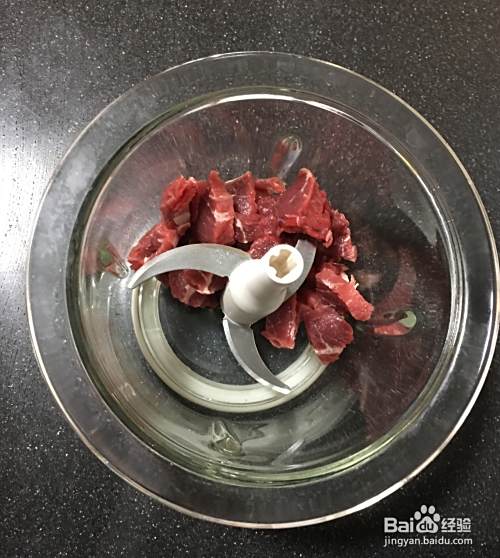 把切成小块的牛肉放入打肉机,接通电源,按动开关,打成肉馅。