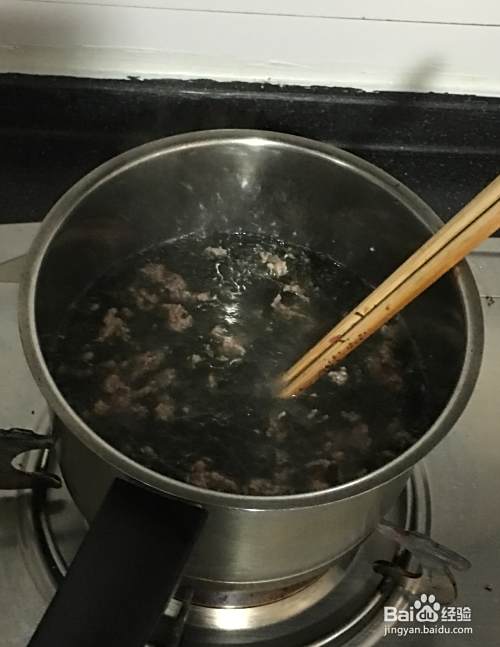 把牛肉馅放入锅中煮3分钟,用筷子打散肉馅,使肉馅均匀受热煮熟。