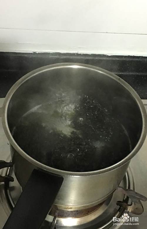 检查紫菜有无杂质,并用手轻轻拍打一下紫菜,使紫菜松散一些,用剪刀剪成小块,把鸡汤放入小锅中火烧开,当汤汁冒大泡时,把紫菜块放入锅中,用筷子搅拌一下,使紫菜全部浸入汤水中。