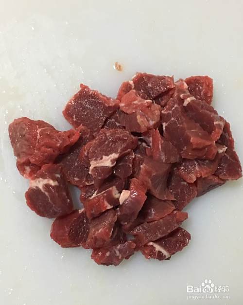 牛肉洗干净,沥干水分,切成小块,最好买黄牛肉,这种牛肉比较清甜嫩滑。
